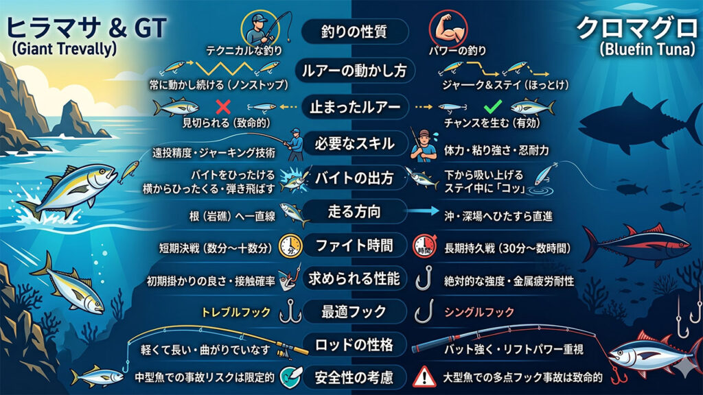 The “Motion” of the Kingfish and the “Stillness” of the Tuna. Once you understand this decisive difference, it changes not only your hook selection but your entire approach on the water. I’ve organized these real-world sensations into a chart.