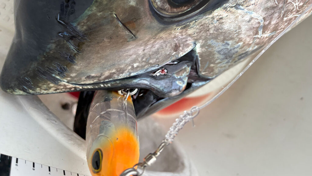 When hooks grab awkwardly in multiple spots, the tuna cannot open its mouth to breathe. Then, the pulling angle becomes distorted, and the fish is forced to come up completely “sideways.”