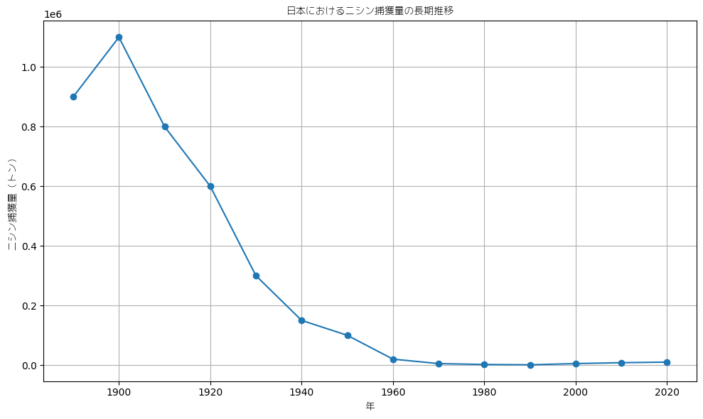 日本のニシン捕獲量の長期推移をデータで紐解くと、その栄枯盛衰は驚くほど顕著です。1900年前後、日本におけるニシン漁は100万トンを超える圧倒的な最盛期を記録していました。