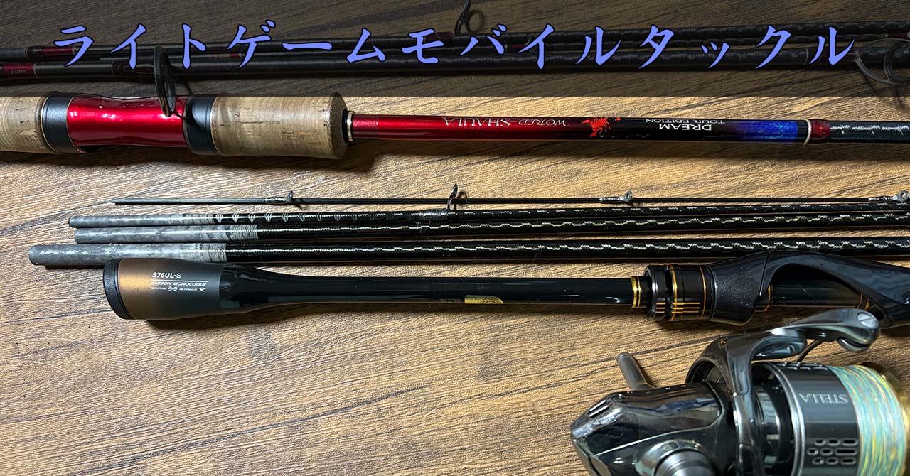 私が愛用しているのは、シマノの『ソアレ エクスチューン MB S76UL-S』というアジング・メバル用のモバイルロッドです。万が一、不意の少し大きなターゲットの可能性がある時は『ワールドシャウラ ドリームツアーエディション』も使います。どちらも仕舞寸法は50cm前後のパックロッドです。