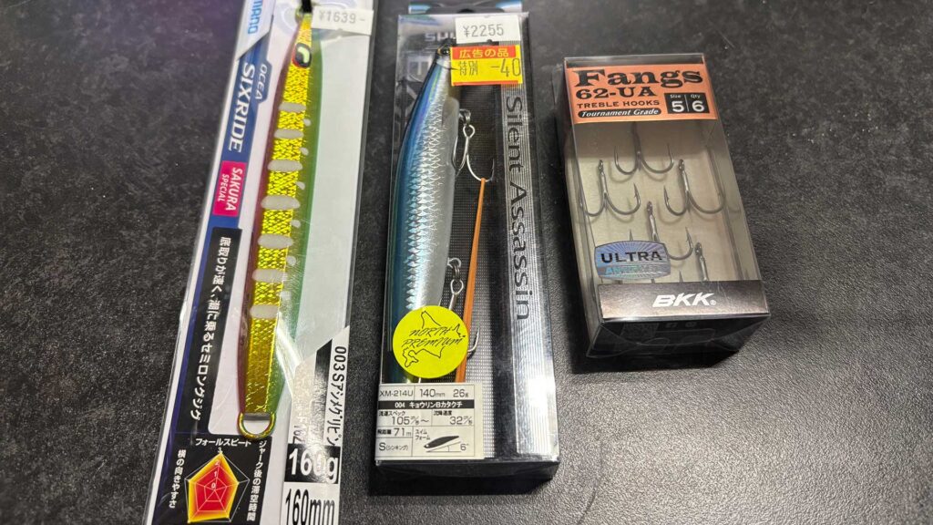 まさにリアクションバイトです。魚の気持ちがよく分かる〜、見ると欲しくなる。ついつい口を使う、ついついpaypay残高確認しちゃう! 追い打ちかけるように40%引きのシール・・・。ジグは新商品のシックスライド、パッケージが変わっているので初めはシマノだとわからなかった(笑)。