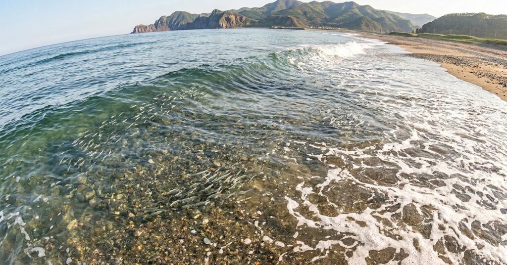 この時期の海辺に立つと、波打ち際でキラキラと光る小さな命の群れを目にすることがあります。春季ブルームによって基礎生産が高まった積丹沿岸には、多種多様なベイトフィッシュが信じられないほどの高密度で密集してきます。