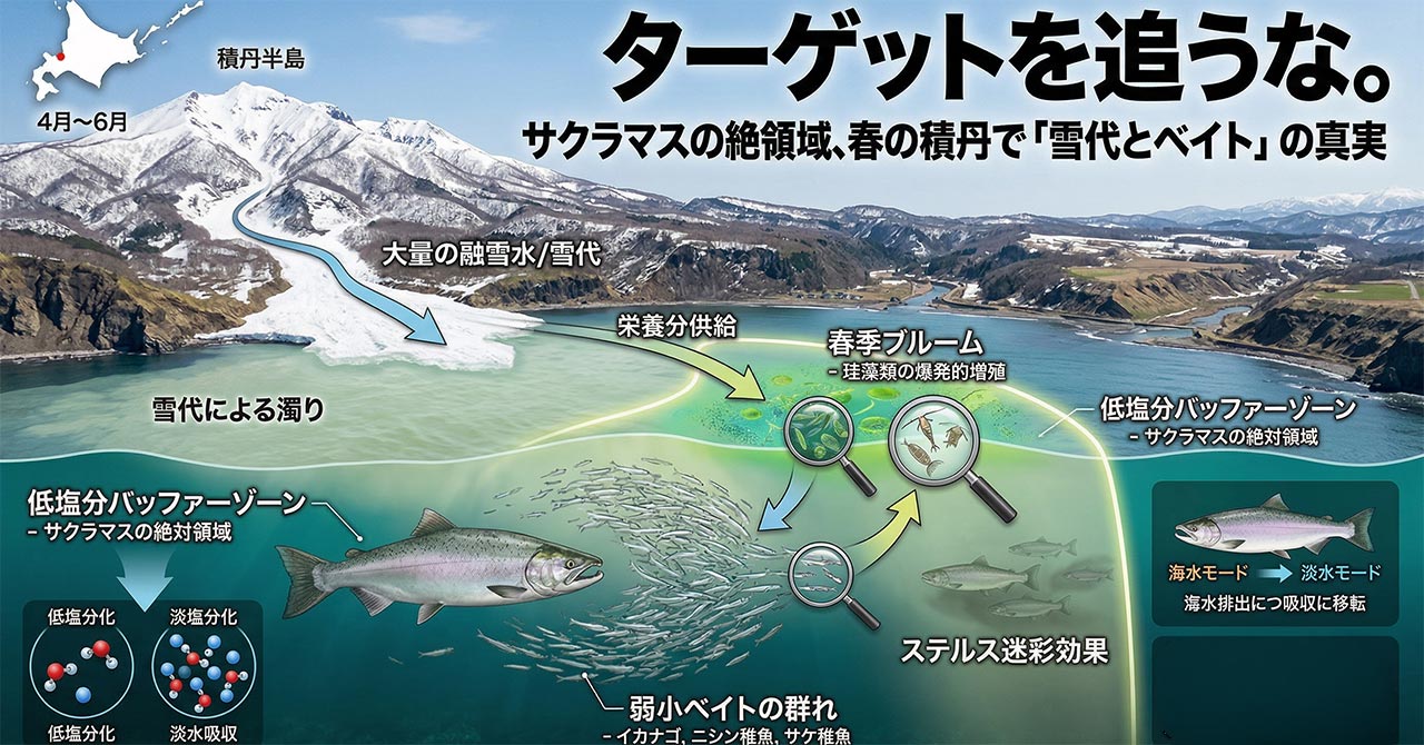 この低塩分化した沿岸エリアは、沖に戻れなくなったサクラマスにとって浸透圧の負荷を劇的に和らげてくれる、まさに理想的な緩衝地帯(バッファーゾーン)として機能します。濁りが入るとルアーが見切られにくくなるというアングラー側の都合だけでなく、魚自身の生理的な限界と遡上への準備が、彼らをこの濁った低塩分エリア(絶対領域)に縛り付けている。これが、春の積丹で雪代絡みのシャローエリアが激アツになる、生態学的な理由なのです。